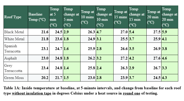 The project used a wooden base for the houses, which were approximately 8cm x 6cm x 12cm, and six different roofing materials. The roof types were black metal tiles, white metal tiles, red terracotta, moss, white terracotta, and asphalt shingles. To do the experiment, she assembled the wooden houses, attached the roofs, and put small thermometers inside them. She also put a lightbulb over them to simulate sunlight. She recorded the temperatures every 5 minutes in several different scenarios, such as moving the houses inside and outside, and making the light less strong. The coolest temperature overall was the green moss, at a cool 63.3 degrees Fahrenheit. And the highest temperature was the asphalt shingles, at a sweltering 148.6 degrees Fahrenheit. All of these results and more can be found on the chart below, which compiles the most important data points.